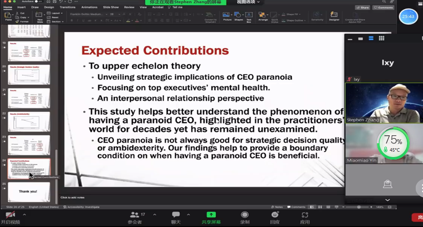 技术经济系邀请到了澳大利亚阿德莱德大学创业学Stephen Zhang教授做题为“Only the paranoid Survive? The implications of Having a Paranoid CEO”的讲座。讲座由尹苗苗教授主持,suncitygroup太阳成集团众多老师、博士生及研究生参加了此次讲座,反响强烈。