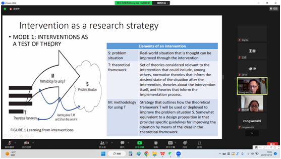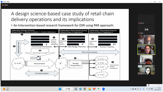 苏教授还以自己2021年发表在SSCI期刊上的一篇设计科学研究论文A design science-based case study of retail chain delivery operations and its implications 为例,详细介绍了该研究的起源、开展实践行动的过程、写作、投稿及修改的全过程。整场报告持续了2个小时,在总结环节,樊雪梅副经理感谢苏教授为我们主讲了案例研究系列四次系统、深入、务实的讲座,并表示未来希望和苏教授有更多的合作。