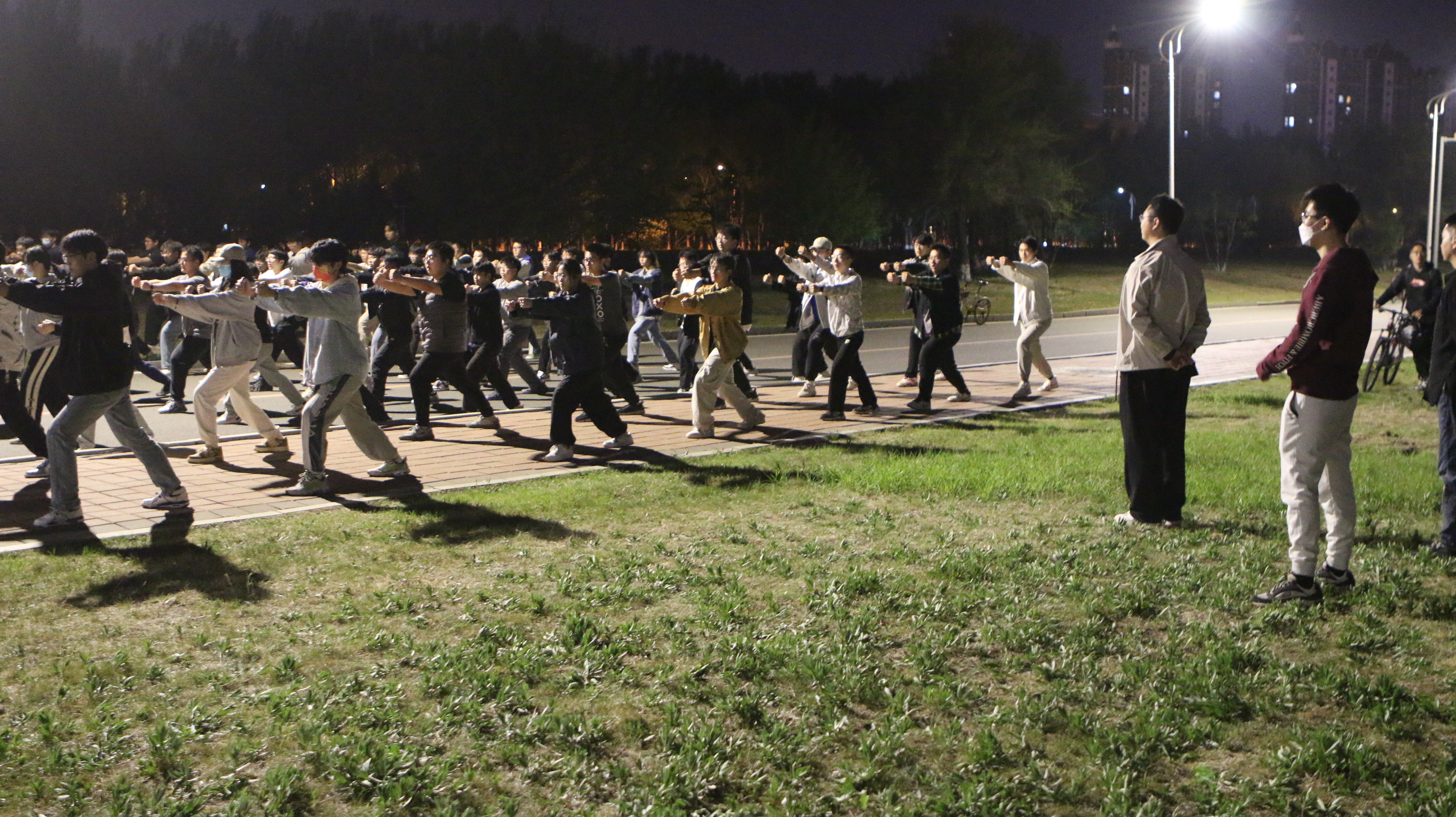 随后,老师们来到八极拳方阵与太极拳方阵训练场地。在领操员的带领下,同学们认真做好每一个动作,大声地喊出口号。每一次抬手,每一次曲腿,每一次转身,每一次出拳,他们都仔细琢磨,反复练习,力求做到精准到位。他们专注的眼神和认真的态度,充分地显示了其对于训练的重视。