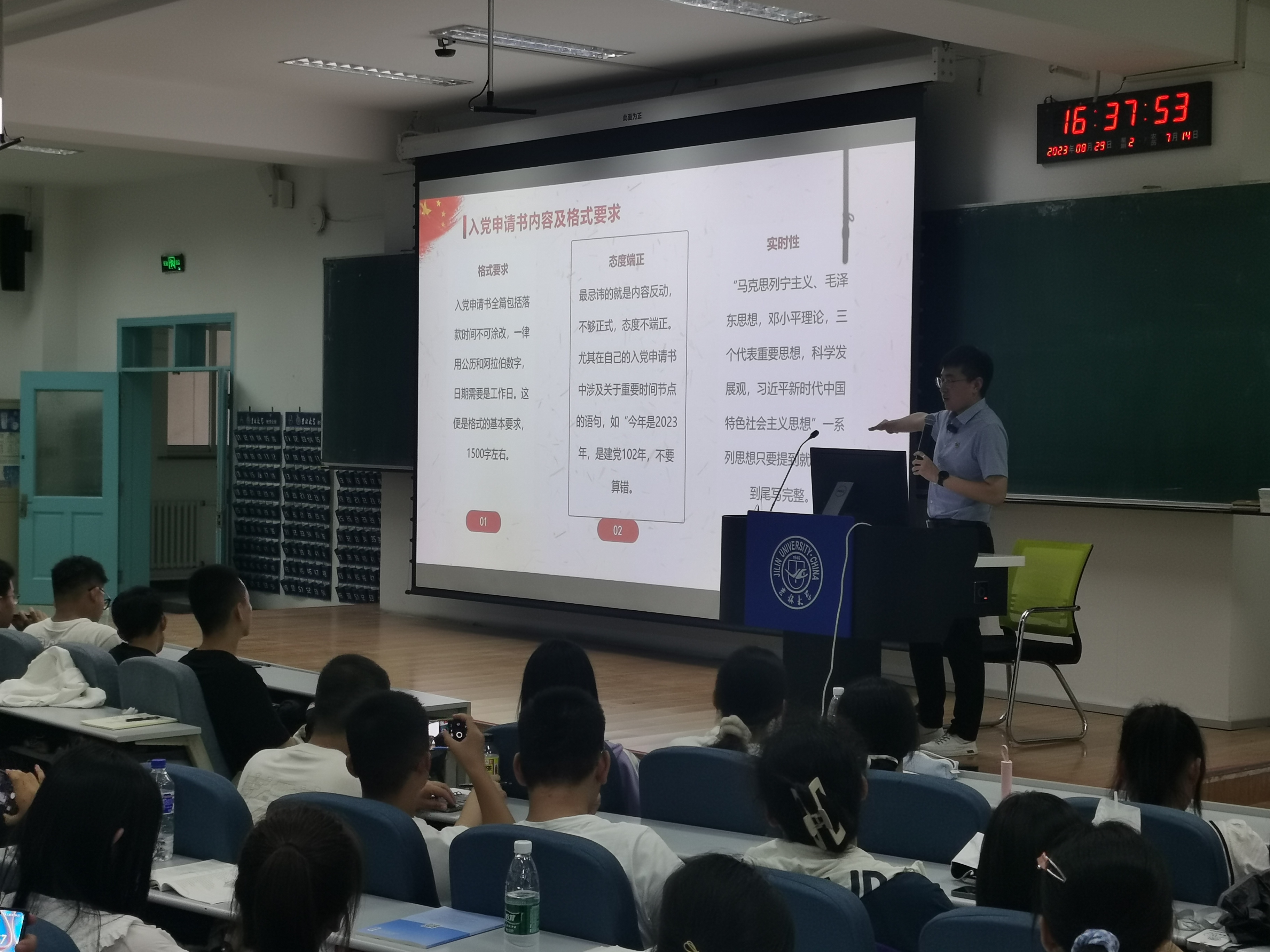 接着,禚传阳老师向大家详细介绍了入党的流程,提交入党申请书,成为积极分子,成为发展对象,成为预备党员,成为正式党员五个步骤,并重点讲解了入党申请书的内容和格式要求,以更好的帮助大家。最后,禚传阳老师期望大家能加强理论学习,学习科学知识,掌握专业技能,将个人理想融入党和人民伟大事业,用奋斗点燃梦想。