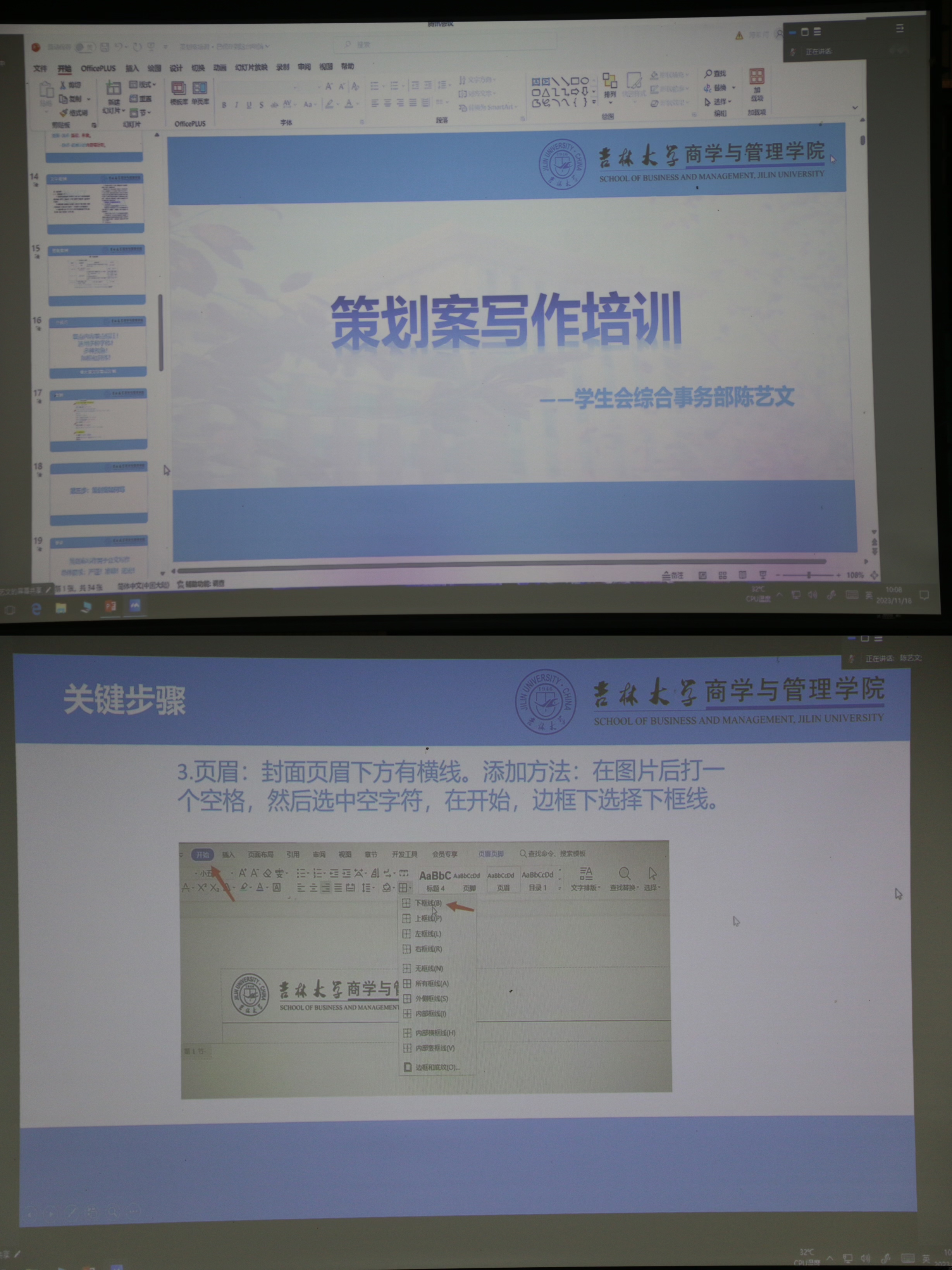 随后,由员工会综合事务部陈艺文讲解策划案的撰写,因陈艺文同学身体抱恙本部分于线上进行。陈艺文同学以什么是策划案、策划案写作注意的内容与策划案如何写这三个步骤展开。陈艺文同学强调,作为团学组织应严谨且周密的把握各方面因素,如策划案内容简单明了、排版整齐美观、活动具体时间地点、各种文字与表格的搭配等,以确保活动的顺利进行。