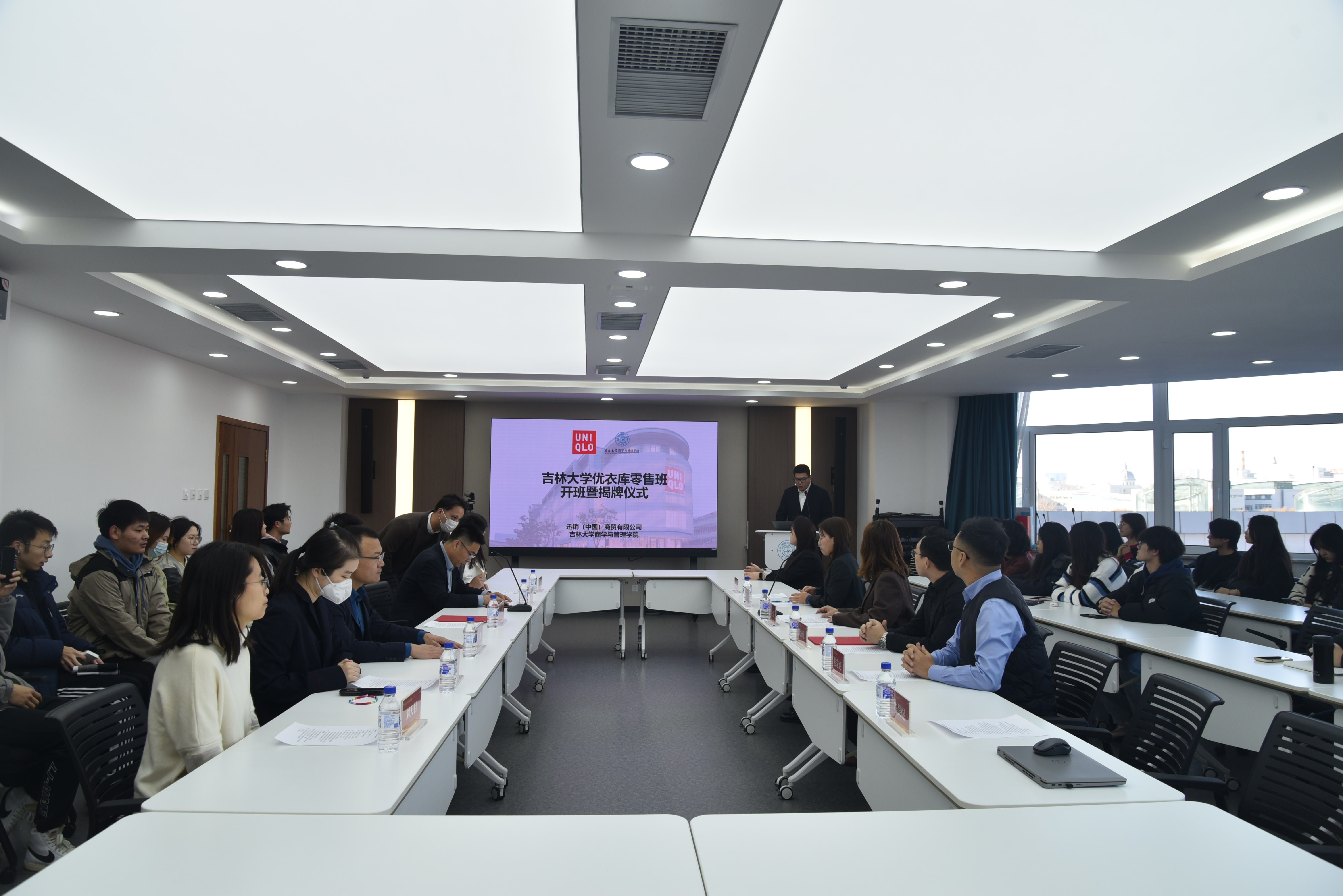 为培养员工就业观念,提升员工就业能力与实践水平,拓展国际视野,2023年11月30日下午13点30分,suncitygroup太阳成集团优衣库零售班开班仪式正式启动。迅销优衣库首席人力资源官毛景弘女士、欧阳煌总监、黄娟经理、营业部东北大区负责人姜宏亮先生、HR陈昊煜先生、黄晟瑄女士;公司党委员工工作部副部长马琨、公司党委副书记兼副经理李帅、党委副书记马腾、研究生管理办公室主任甄宓、员工工作办公室主任丁越、团委书记刘天目参加了此次优衣库零售班开班暨揭牌仪式。