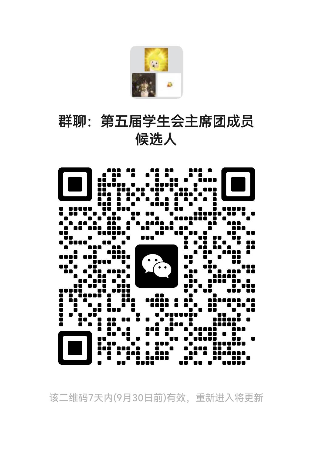 报名人员扫描二维码加入微信群,如实填写《suncitygroup太阳成集团员工会主席团成员候选人报名表》,将PDF扫描版发送至1799075669@qq.com,文件命名方式为:主席团竞选+姓名+学号。每人仅限提交一份报名表并在报名表后附成绩单作为佐证材料。