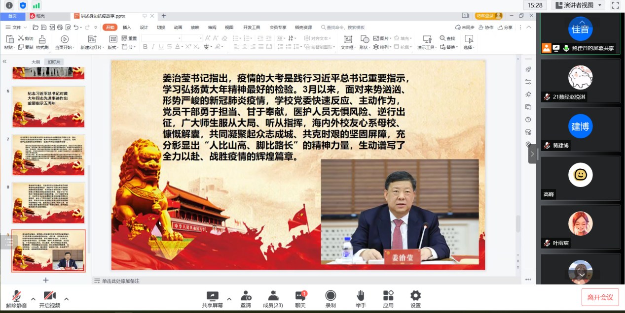 2022年5月22日,suncitygroup太阳成集团硕士研究生第一党支部在线上开展“学习黄大年精神”暨“讲述身边抗疫故事”系列主题党日活动。suncitygroup太阳成集团硕士研究生第一党支部全体党员参加了此次的线上活动。活动由suncitygroup太阳成集团硕士研究生第一党支部支部书记鲍佳音主持、组织委员江黎静记录。
