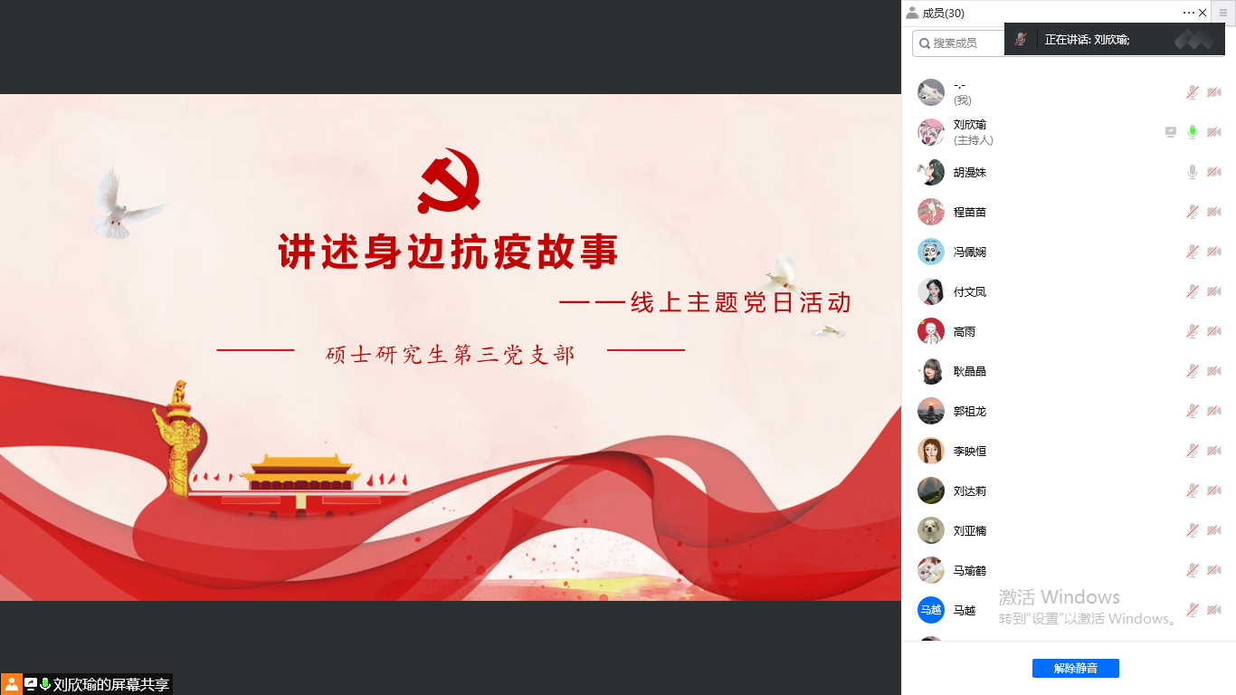 随后,大家一起观看了“让鲜红的党旗高高飘扬在战疫一线”短片,了解了suncitygroup太阳成集团师生的抗疫事迹。接着,南苑八公寓a区楼长徐斌同志通过三个剪影为大家分享了他身边的抗疫故事,表达了对在抗疫过程中做出贡献的党员师生的感激和感动之情,也表达了对积极配合抗疫工作的同学们的感谢之情。