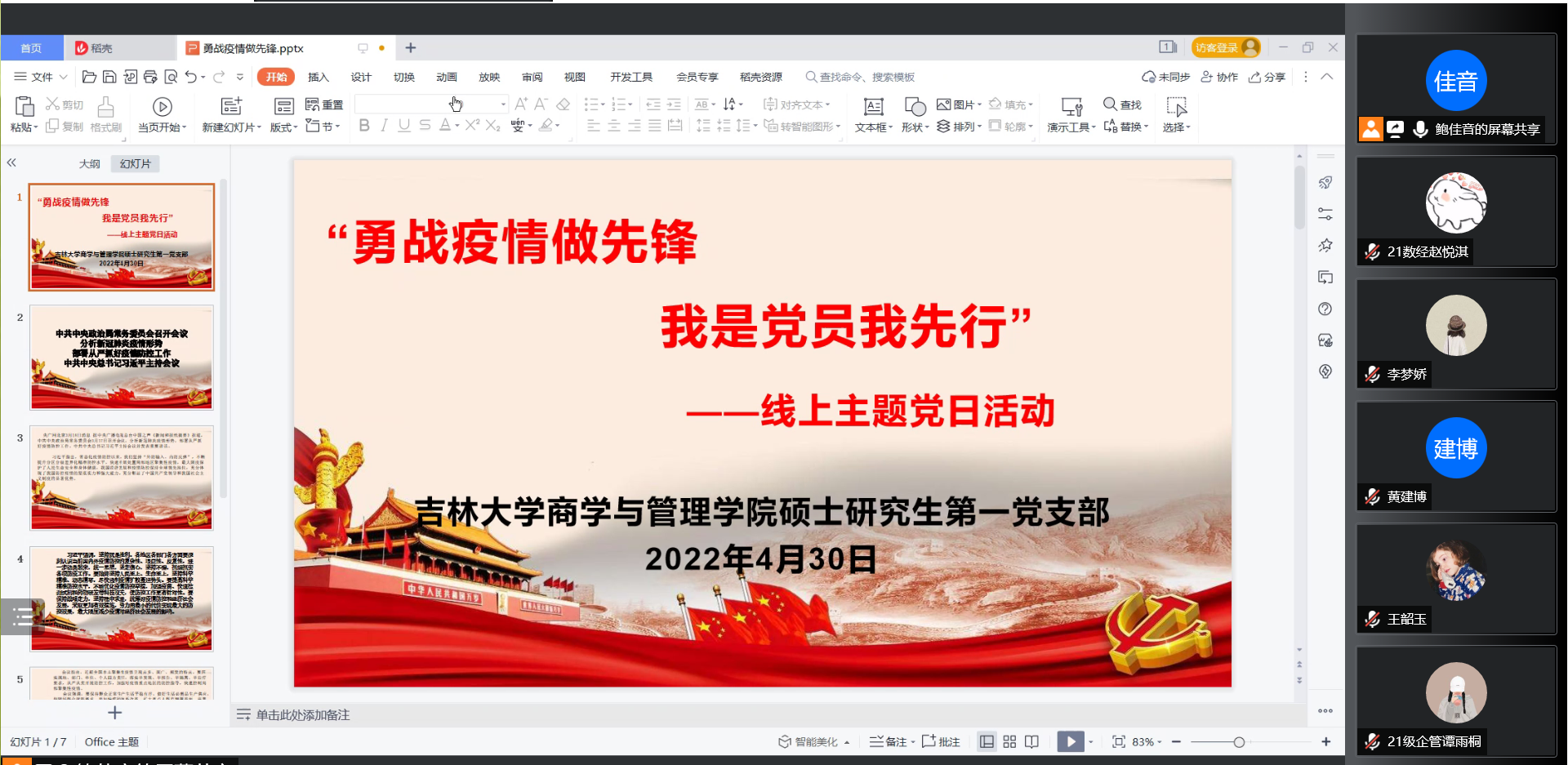 2022年4月30日,suncitygroup太阳成集团硕士研究生第一党支部在线上开展以“勇战疫情做先锋 我是党员我先行”抗击疫情为主题的党日活动。suncitygroup太阳成集团硕士研究生第一党支部全体党员参加了此次的线上活动。