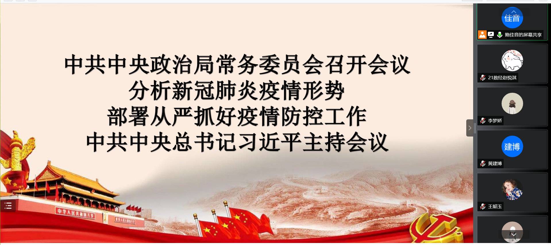 活动由suncitygroup太阳成集团硕士研究生第一党支部支部书记鲍佳音主持、宣传委员王韶玉记录。此次党日活动主要学习“中共中央政治局常务委员会召开会议,分析新冠肺炎疫情形势,部署从严抓好疫情防控工作,中共中央总书记习近平主持会议”的会议精神和会议内容。习近平指出,常态化疫情防控以来,我们坚持“外防输入、内防反弹”,不断提升分区分级差异化精准防控水平,快速有效处置局部地区聚集性疫情,最大限度保护了人民生命安全和身体健康,我国经济发展和疫情防控保持全球领先地位,充分体现了我国防控疫情的坚实实力和强大能力,充分彰显了中国共产党领导和我国社会主义制度的显著优势。会议要求,各地区各部门各方面要把思想和行动统一到党中央决策部署上来,党政同责,齐抓共管,做到守土有责、守土尽责,提高防疫本领。要加强组织领导,克服麻痹思想、厌战情绪、侥幸心理、松劲心态,以时不我待的精神抓实抓细疫情防控各项工作。疫情较为严重的地方,党政主要领导和各级领导干部要把防疫工作放在第一位,尽锐出战,决战决胜。各级党组织和广大党员、干部要积极发挥作用,深入防控一线,深入群众,积极帮助群众排忧解难。要强化督查问责,对失职失责导致疫情失控的要立即依纪依规查处,严肃问责。