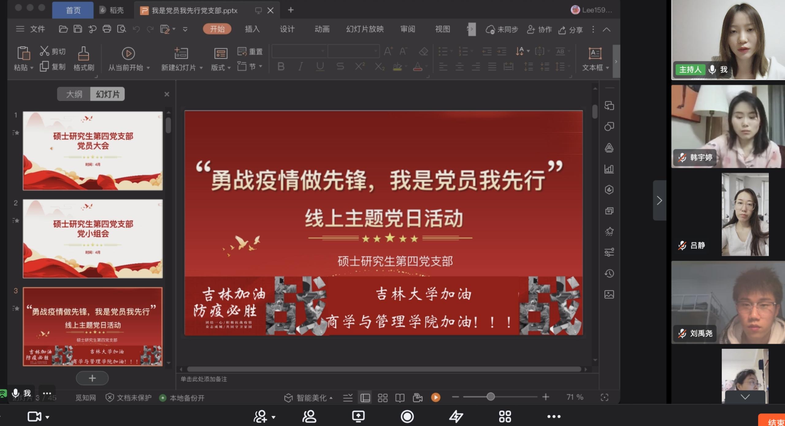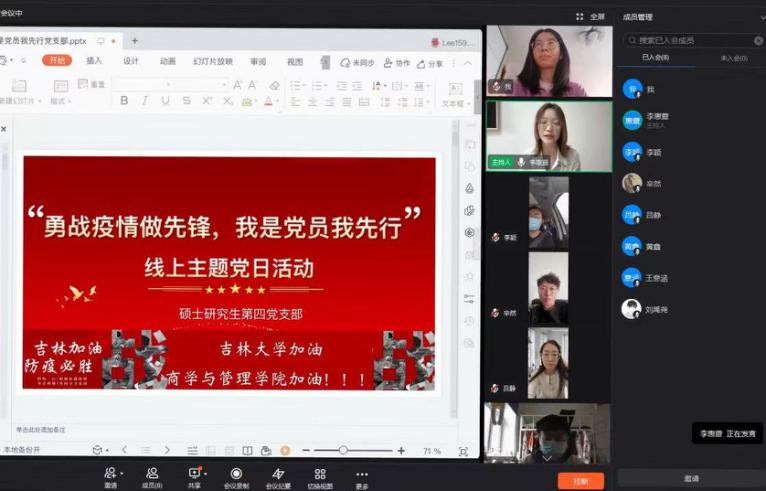 为深入贯彻落实习近平总书记关于新冠疫情防控工作的重要讲话重要指示精神,落实suncitygroup太阳成集团疫情防控工作会和相关要求,结合公司实际,鼓励大家继续坚定信心抗击疫情,suncitygroup太阳成集团硕士研究生第四党支部开展于4月27日,下午17:10在线上钉钉会议室开展了以“勇战疫情做先锋,我是党员我先行”为主题的党日活动,调动党员及党员干部抗疫的积极性,增强党员们带领群众打赢抗疫战的信心。
