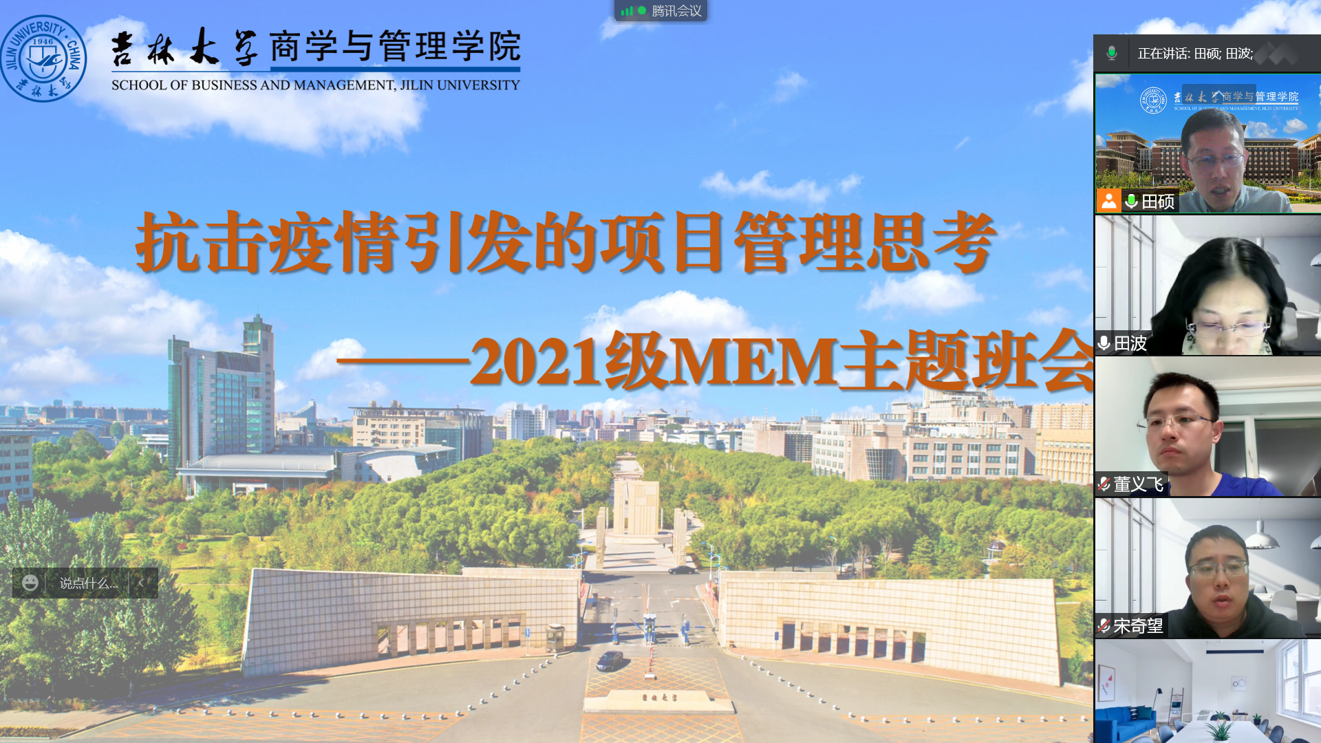 为切实关注疫情期间员工生活、学习及心理状态,促进师生间的交流沟通,排解在线学习中的困扰,suncitygroup太阳成集团工程管理系主任田波教授、2021级MEM班主任田硕教授组织召开“抗击疫情引发的项目管理思考”主题班会,2021级MEM班全体学员共同参会。