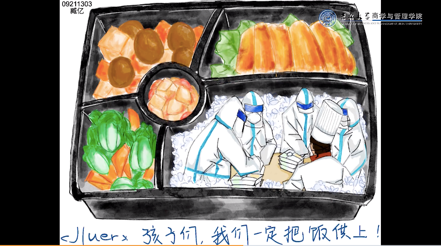 活动由信息管理系邓君主任策划,秉持疫情防控与封寝期间切实做好对员工“关心关爱”的初衷,积极响应校院防疫政策,有效提振师生抗疫信心,适时纾困员工封寝心态,用笔尖与色彩讴歌使命担当,彰显家国情怀。同学们踊跃创作,积极投稿,共计16名本科生与研究生参与绘画与后期视频制作,上交作品共29幅。一幅幅纪实画面描摹与重现了公司上下一心抗疫、振奋人心的情景,包括赵军书记、李北伟常务副经理、马腾副书记、李帅副书记、各位研究生与本科生辅导员和员工志愿者群体驻校抗疫、搬运物资等真实场景。此外还包括了数幅自由创作的艺术作品,一句“我们一定会把饭供上”感人心脾,一句“谢谢辛苦了”的标语温暖“大白”的心;一句“疫情特殊期间我得照顾好他们”热泪盈眶……画展整体风格主要采用令人身心愉悦的轻松漫画形式,深深地表达出同学们对医护人员、工作人员、驻校抗疫老师以及员工志愿者们无私奉献的感谢和敬意。最终,画展以小视频形式在微信视频号发布,受到了大家的一致好评与热烈喜爱,获得了广泛的关注与转发,具有一定的院内外、校内外影响力。