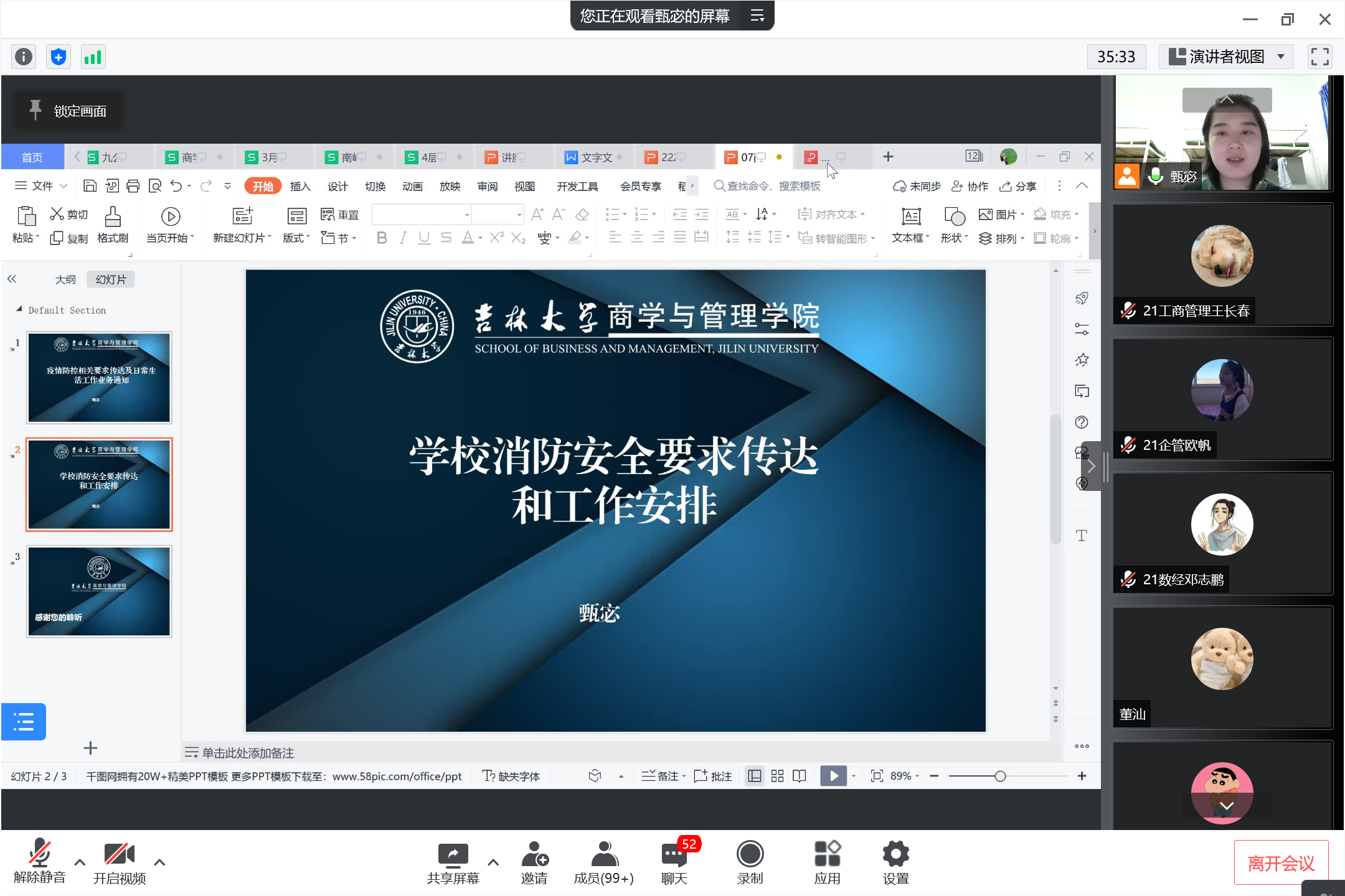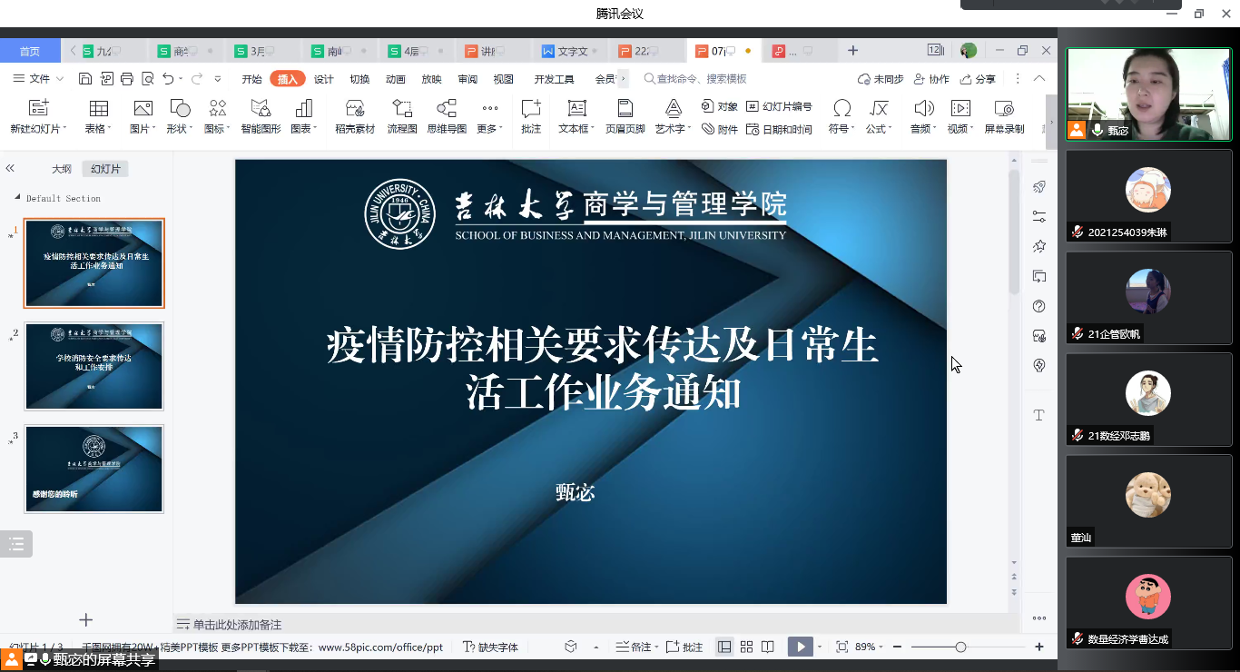 会议第二部分,甄宓老师传达了当前研究生日常工作的部署安排。关于心理方面,甄老师叮嘱同学们不仅要时刻关注自己的心理状况,同时也要关注到身边同学的心理状态,学会自我调节,并综合利用公司、公司提供的心理健康支持资源,充实自己,做彼此间的“心理卫士”;关于用药就医方面,甄老师嘱咐同学们时刻关注自身的身体健康状况,如需就医用药要第一时间与辅导员联系。对于非急性疾病要理解校医院的“用药辅导”举措,与医生沟通要清晰明确,减少不必要的麻烦;关于就业方面,甄老师强调不要因为疫情而耽误就业和政审,要及时与辅导员及就业助理联系,鼓励毕业生在疫情和毕业论文双重压力下,要及时调整心态,认真对待论文,加强与导师的交流,切勿产生懈怠心理;关于校外居住的同学方面,甄老师强调一定要注意个人防护,积极配合社区工作,保持沟通顺畅,出现问题要第一时间联系辅导员。
