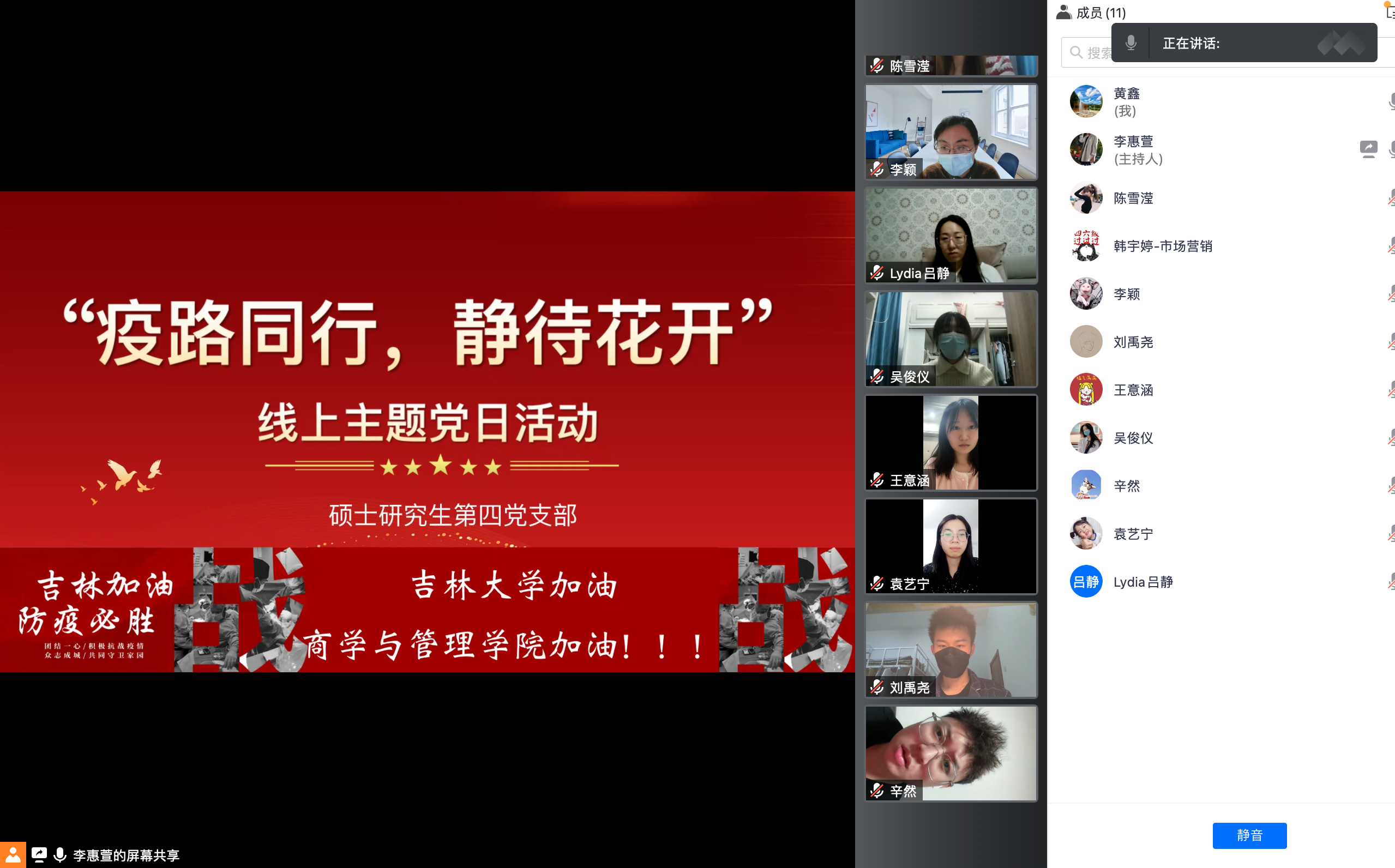 吉林省新冠肺炎疫情防控形式日益严峻,这个三月,全体吉大人以敢战必胜的勇气与决心,积极夺取疫情防控阻击战的全面胜利。为调动党员及党员干部抗疫的积极性,增强党员们带领群众打赢抗疫战的信心,suncitygroup太阳成集团硕士研究生第四党支部于3月24日19:00,在线上腾讯会议开展了以“疫路同行 静待花开”为主题的党日活动。支部全体党员及支部参与志愿者工作的积极分子参与了此次活动。