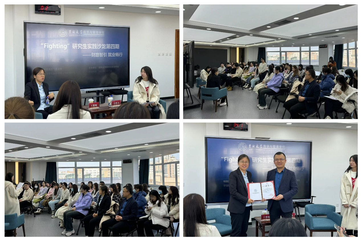 本期活动分为访谈环节和提问环节。访谈环节中,王俊敏女士首先分享了自己的就业经历和心得体会。她指出,在做自身职业规划的时候需要有前瞻性思维和发展性眼光,不能仅局限于现阶段,要选择更有利于自身成长和发展的岗位。其次,王女士表示在信息爆炸的时代,对于企业和岗位的信息不对称性降低,我们需要更敏锐的感知行业动向,形成自己的思维和反思,这对于自身能力的培养和思维习惯的养成都是非常重要的,这也是目前企业所需要和职场人所必备的能力。同时她建议现阶段同学们需要学习好基础知识,具备基本的专业技能,才能与未来工作岗位所要求的技能相匹配。此外,就不同的岗位发展历程,现场以财务行业为例,向大家介绍了技术岗、管理岗等不同岗位的技能要求和发展规划,帮助同学们结合自身实际情况寻找更适配的发展方向。在自由提问环节,同学们积极参与,向王俊敏女士提问了关于个人职业规划、新员工职场困境、实习选择等问题,都得到了耐心的答疑解惑。最后,她建议同学们在实习过程中要有所反思,有所沉淀,拒绝无效实习,新员工要有好奇心,有敢做敢犯错的胆量和勇气,要培养自己各方面基本素质,建立具有长远发展的实习规划和求职目标。最后,马腾老师代表suncitygroup太阳成集团向王俊敏处长颁发聘书,聘请王俊敏处长为“Fighting”研究生实践沙龙第四期讲师,本次实践沙龙活动在同学们热烈的掌声中圆满结束。